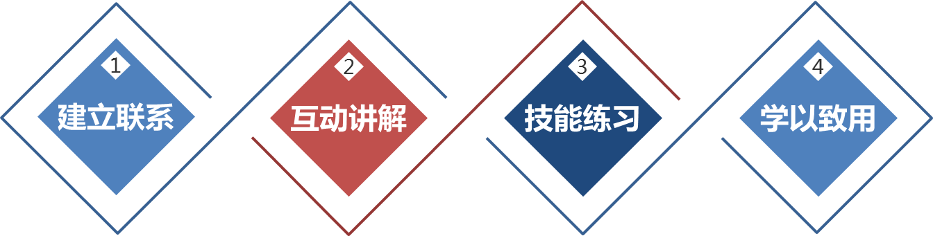 一个完整的教学过程由图2-8的四个阶段组成,分别是建立联系、互动讲解、技能练习和学以致用。在每个阶段,我们都会选用最适宜的教学活动应用到教学的不同阶段。所有学习活动要以学员的学习为中心进行设计,学员为中心的学习活动最大的特点是学员是主角,而且是以学员的学以致用为目的。