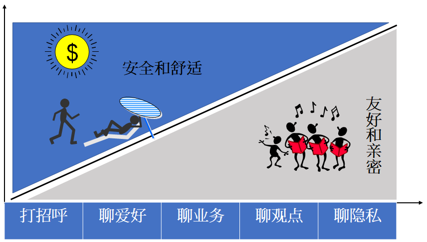 总结一下,聊天是一门艺术,如何从打招呼、聊爱好、聊业务、聊观念到最后聊隐私。没有说一些场面话,就更没有机会说心里话了,从开始聊些安全话题到最后聊能建立链接和友好关系的风险话题,向客户逐步打开心扉,就可以建立良好的私人关系。相反,如果你永远在与客户聊天气、八卦新闻,那你与客户的关系就一直停留在工作空间而到不了对方的私人空间,你与客户就永远是工作关系。