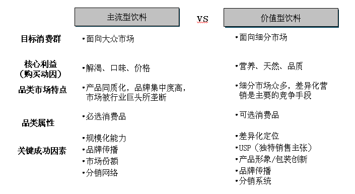 需要提醒的是价值型饮料的细分问题:不是指消费者年龄、收入、职业的细分,而是口味与消费观念—也就是产品概念及诉求可以引导的—细分,以中国人目前的可支配水平,饮料的价格已经不是一个购买障碍,产品的需求动机才是关键。