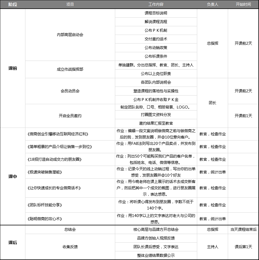 在开课之前,微商团队长要根据工作内容确定各个环节的负责人,做好开课前的人员分工。为了提高培训过程中运营人员的沟通效率,根据工作人员的功能划分,建群做针对性沟通,可以建以下4个群: