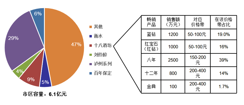 泸州老窖在保定的产品线分布从7~1000多元,在400元以上、200~400元、150~200元、100~150元、50~100元、20~50元等多个价格段上均有1~2款畅销产品。