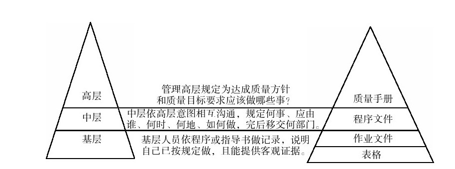 从图1-1可以看出,以往版本的体系文件的层次非常清晰,对应的管理层也很明确,各部门在质量手册的总要求下按照5W1H的法则起草相关文件,设计相应表格实施运行,并留下运行记录,是一套非常完善的质量管理系统。