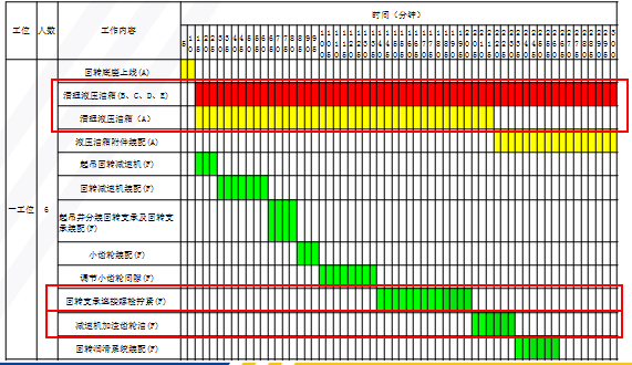 单工位装配的效率普遍都不高,真正装配的时间很少能到达总工作时间的40%,大量的时间用于物料搬运,工具/图纸准备,作业等待。使用叉车/拖车取代吊车进行部件/物料搬运是提升效率的关键。此外,这种装配多数是多人作业,即使在物料/工具/图纸准备齐全的情况下,几个人之间的配合不佳也会影响效率,此时多人联合作业图是效率分析的关键。如图6-3所示。