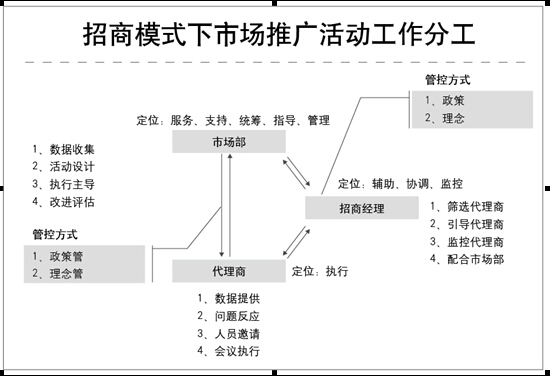 3.合理分工。假如是开会,就涉及当地的配合,在代理商、企业招商经理和市场部之间,要做好合理分工,并用奖励政策保障这种分工的落实。如图8-3所示。