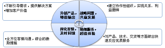 对工业品的一对一的客户营销来说,深化客情是一项永恒无止境的工作, “没有最好,只有更好”。企业应该成立专门的客情部或大客户部,主要职责是处理客户投诉、定期开展客户满意度调查,确保全方位、及时顺畅的客情沟通。部分企业为了做得更到位,还在内部推出各种以“深化客情”为主题的激励措施,要求各部门围绕“提升客户满意度”,进行政策层面乃至组织层面的改革。