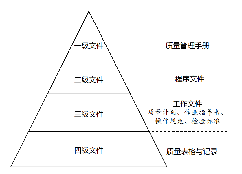 名称:工作文件,描述子流程,是二级文件的支撑文件,包括质量计划、作业指导书、操作规范、检验标准,是部门间具体质量活动、操作标准和要求。