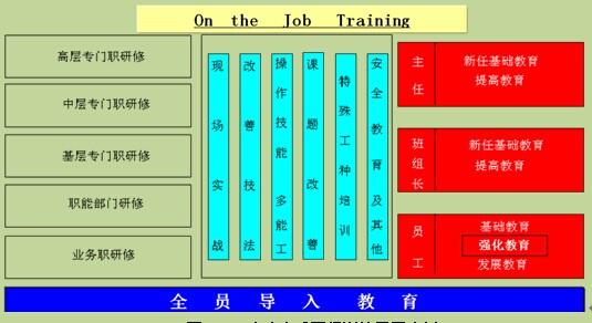 人才培养是一种文化,把人才培养概括成文化,足见其影响之大、影响之深,它已经成为某些公司独特的企业文化不可分割的一部分。丰田人才培养的基础是OJT,OJT与配套的“人事制度”和“系统教育”相结合,促进人才不断成长。让我们着重关注一下在整个培训体制中极为重要的OJT培训,如图3-25所示。