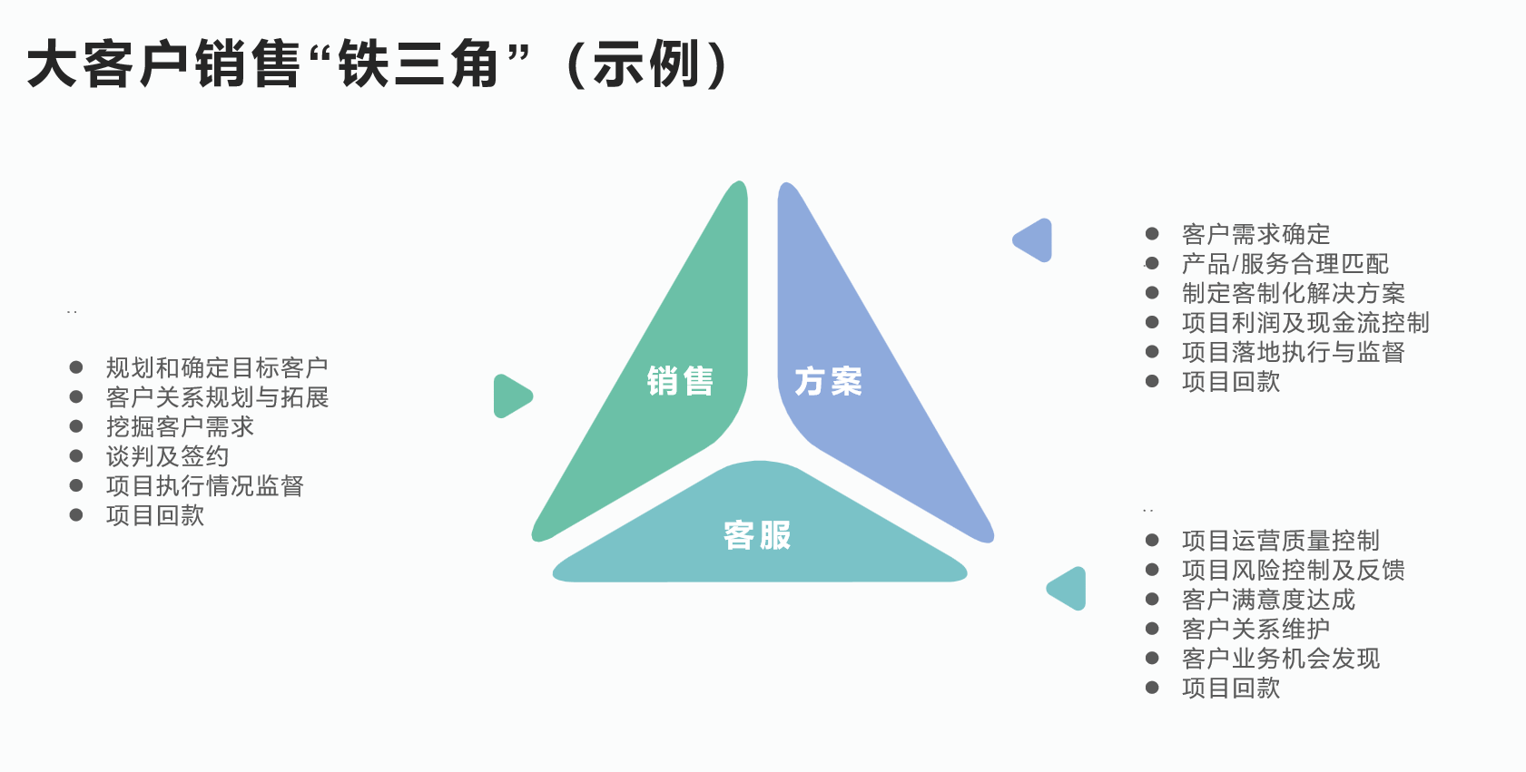 首先,我们在上文说过,大客户需要的是一个销售人员或团队服务到底,他们不希望今天找你销售、明天要找你客服、后天还要和你的运营打交道,尤其是客户业务的负责人更是如此。