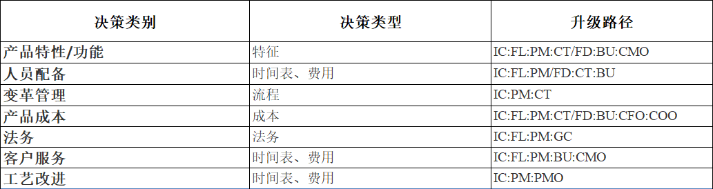 升级不仅仅适用于开发阶段,如果出现问题,公司可能需要升级产品组合管理活动中的问题。项目升级图描绘了有效决策的责任和沟通路径,如表9-2所示。