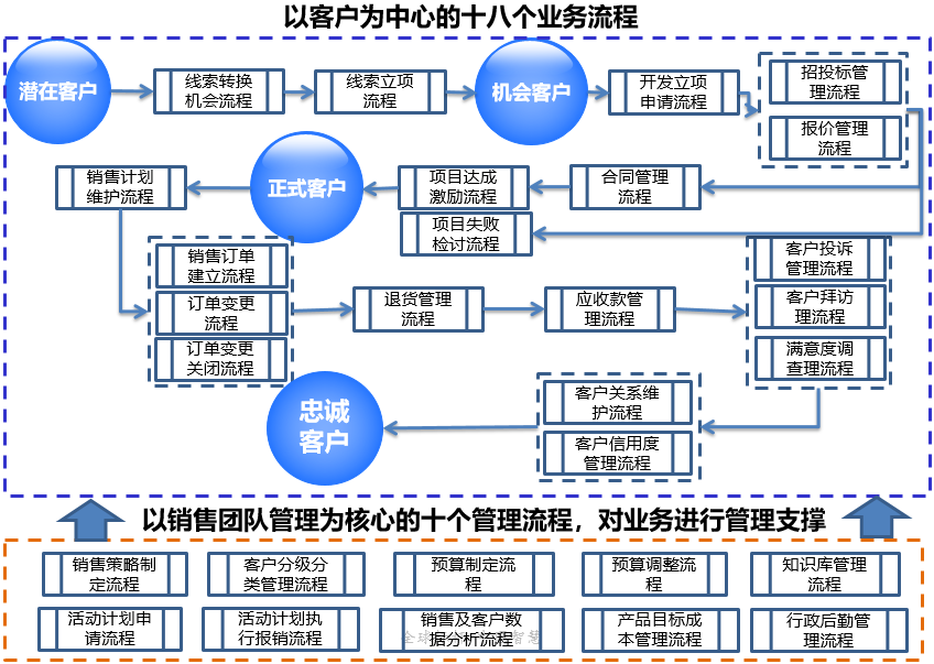 基于此业务架构,同步做了一些制度保障,比如销售预算、销售绩效激励,客户分级分类等制度保障,另外成立了市场管理部,对营销内部进行资源统筹协调,然后根据业务架构展开流程规划,后面共完成了28个核心流程,基本覆盖了营销模块的所有业务。最后在流程建设的基础上导入了CRM系统,经过将近6个月的LTC流程变革加上CRM系统导入,营销模块的业务变革取得了阶段性成果,并促进公司当年销售额增长了30%,在当年下半年,公司顺利在深圳中小板上市。