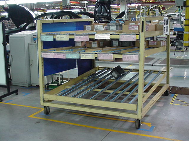 每种零件需要占据一条滑道而超市料架所能容纳的零件种类是有限度的,当某种产品例如车门把手具有多种颜色选装件时,则必须使用同步供货(排序供货)。