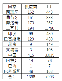 Inditex的37%供应商是在总部的西班牙,附近邻国的葡萄牙,摩洛哥和土耳其,根据Zara母公司官网2020年年报表示,现在它们有在50个国家和地区,合计1805家供应商为它们提供产品和服务,主要集中在12个国家,共有1398家供应商和7903家工厂,明细可见如下