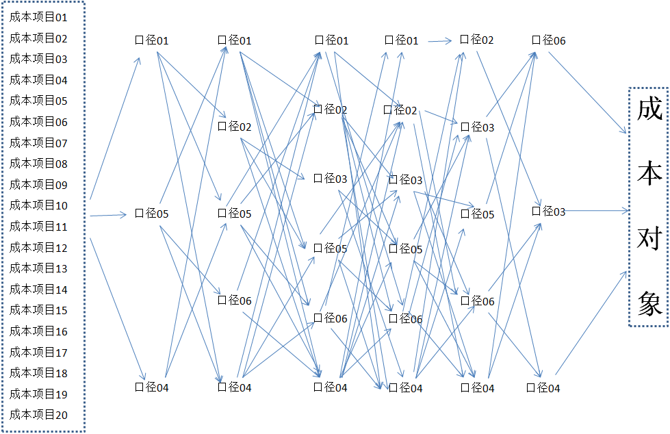 网状结构示意图和平行结构示意图的形式不同,内容和意义完全一样。示意图说明,无论费用的归集口径是什么,最后均分摊到多维组合的成本对象。示意图反映了将不同口径归集的费用向成本对象分摊的过程,这一过程就是分摊路径。