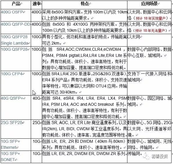 苏州旭创专注于10G/25G/40G/100G/200G/400G高端光通讯收发模块的开发、制造和客户技术支持,重点开发高速率、小型化、低功耗、低成本的高速光模块,为大型数据中心、数据通信、长途传输、无线网络等领域客户提供高性价比的光通信模块解决方案。公司的数通产品在全球领先,主要产品及应用场景如表6-25所示。