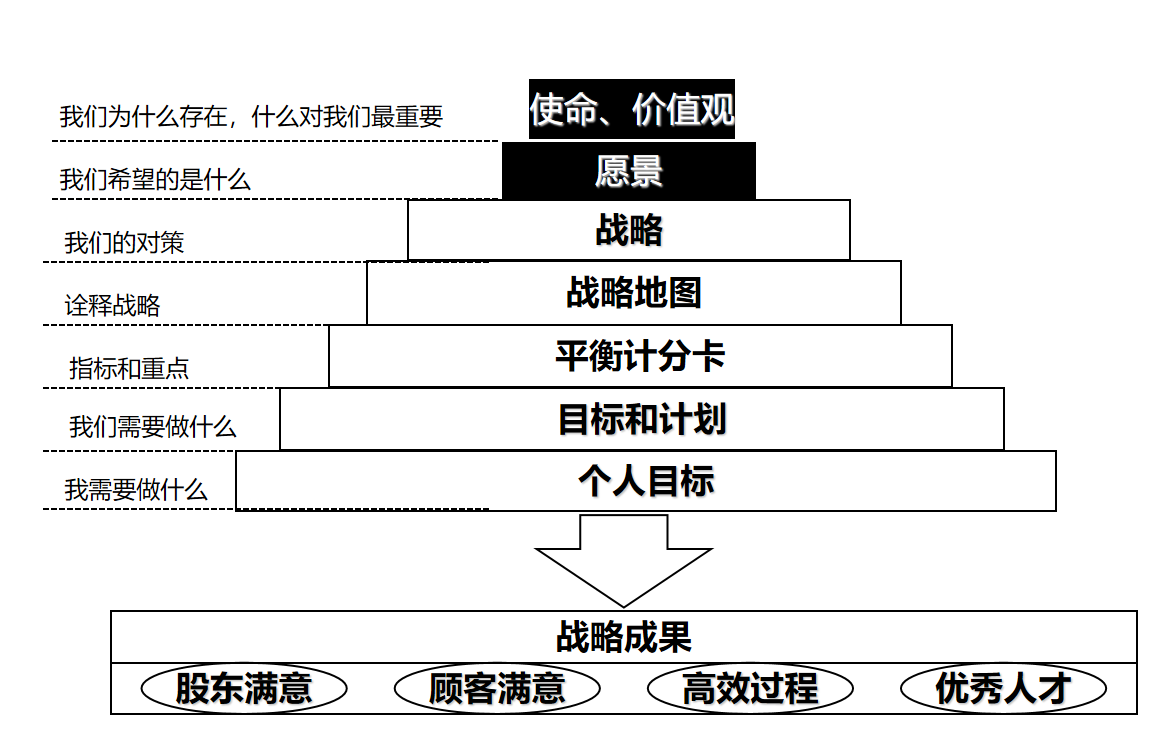 战略解码就是通过可视化的方式,将企业的战略转化为全体员工可理解、可执行的行为的过程。战略解码也是将公司战略重点进行清晰地描述,并转化为具体行动的过程,是“化战略为行动”的有效工具。战略解码同时还是一种工作方法,通过集成高层团队的智慧,采用集体研讨的形式,对公司的远景目标和战略举措达成共识,以员工能够理解的形式清晰地描述出来,同时制定出相应的具体行动计划,然后逐层分解责任到人,并在后面的执行过程中反复对照、质询和提升的过程。