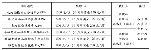 :这个方案设置了一次抽检批次合格率目标、成品抽检不良率目标、胶壳报率目标,并分阶段对所达成的目标进行奖励,方案的最后一部分是改善动作。