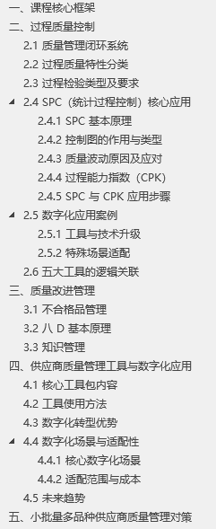 本次课程聚焦质量过程控制和改进管理,主要涵盖两大核心模块。第一模块为过程质量控制,包含过程质量控制核心内容、SPC(统计过程控制)与 CPK(过程能力指数)应用、生产数字化案例三部分;第二模块为质量改进管理,围绕不合格品管理和八 D 基本原理展开,同时串联质量管理工具的逻辑关联与实际应用场景。