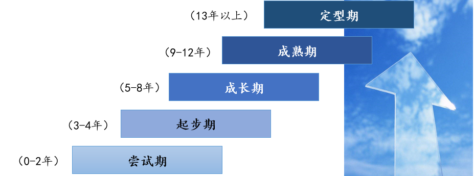 这个阶段,也是每个人的职业发展阶段。从懵懂入场、渐入社会角色到华丽谢幕,回归家庭本位。若聚焦工作时期,每位职场人士的职业发展阶段可分为五个时期:尝试期(0~2年)、起步期(3~4年)、成长期(5~8年)、成熟期(9~12年)与定型期(13年以上)。如图3-3所示。