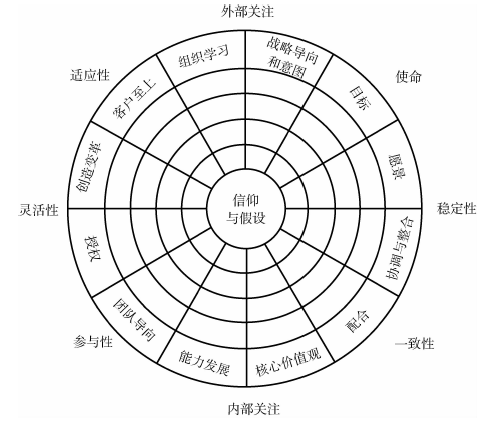 适应性和一致性是矛盾统一体,反映了快速适应和内部一致的“变与不变”。使命与参与性反映了企业战略目标和价值观的“跟与不跟”,适应性与参与性反映了外部动向的“战与不战”,使命与一致性反映了官僚等级体系的“破与不破”。