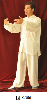 接上式,腰微拱,重心后移落在右腿上,呈后倚。左臂屈肘回收至左肋旁,掌心翻转朝上。身体向右转面向西南,随之腰向后里转,重心移落左腿上;右腰微上提,右腿提膝向前迈步,同时右勾手变掌向西南推出,掌心向外,高略与肩平,变右弓步;腰微后拱,重心落至左腿。右臂回收里旋,掌心翻转向里。左手经胸前向右上划弧掤,掌心翻转向里,两臂弧形,掌指相对,向外撑圆。腰上提, 左膝微提,左脚向左前迈步;腰微拱,重心后移至右腿,腰上提, 身体微前移,弓左膝。左手臂向左外翻转上升举过头顶,手腕翻旋, 掌心向外架于左额前上方。右掌由胸前外翻旋,向西南推出,眼神向前平视(见图6-378至6-382)。