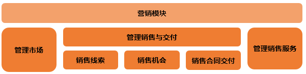 对业务模块进行分析后,再对实际业务进行分析,如销售与后端交付过于笼统,需要进一步拆分。根据销售项目的先后顺序分解为销售线索、销售机会、销售合同三个环节,这样就形成了大致的业务架构规划。如图2-1所示。