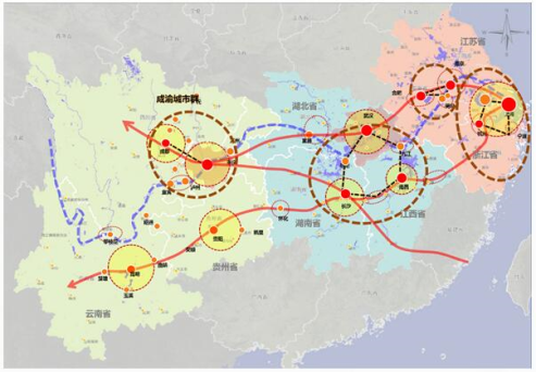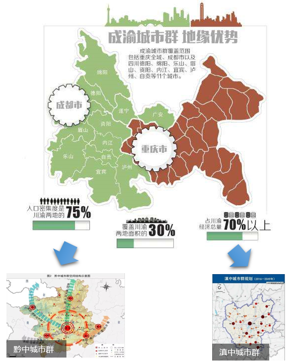 成渝城市群是长江经济带的重要组成部分,也是西部大开发的增长极和引擎。成渝城市群将作为重要的战略支撑引领长江经济带“三大两小”经济群联动开发。(“三大两小”城市群包括三大跨区域城市群:成渝城市群、长江中游城市群、长三角城市群;两个区域性城市群:滇中、黔中城市群。)