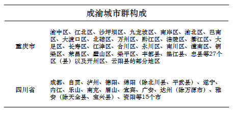 成渝城市群是国务院批复的第四个城市群,由重庆市的渝中区、江北区等27个区(县) 以及四川省的成都、自贡等15个市组成。
