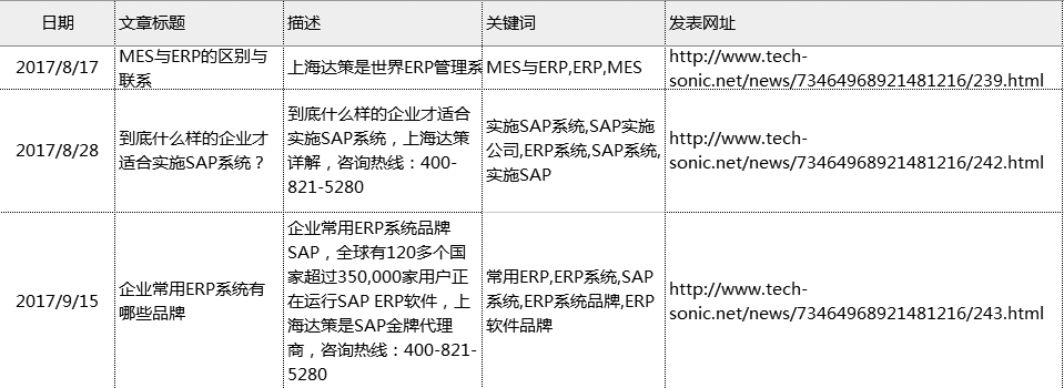 注解:这是网站更新内容的记录,网络营销人员要准确填写更新时间、新文章的标题、关键词和描述,以及发布到网站后的网址,可根据企业自身的能力来规定一个月更新几篇文章,如表7-12所示。