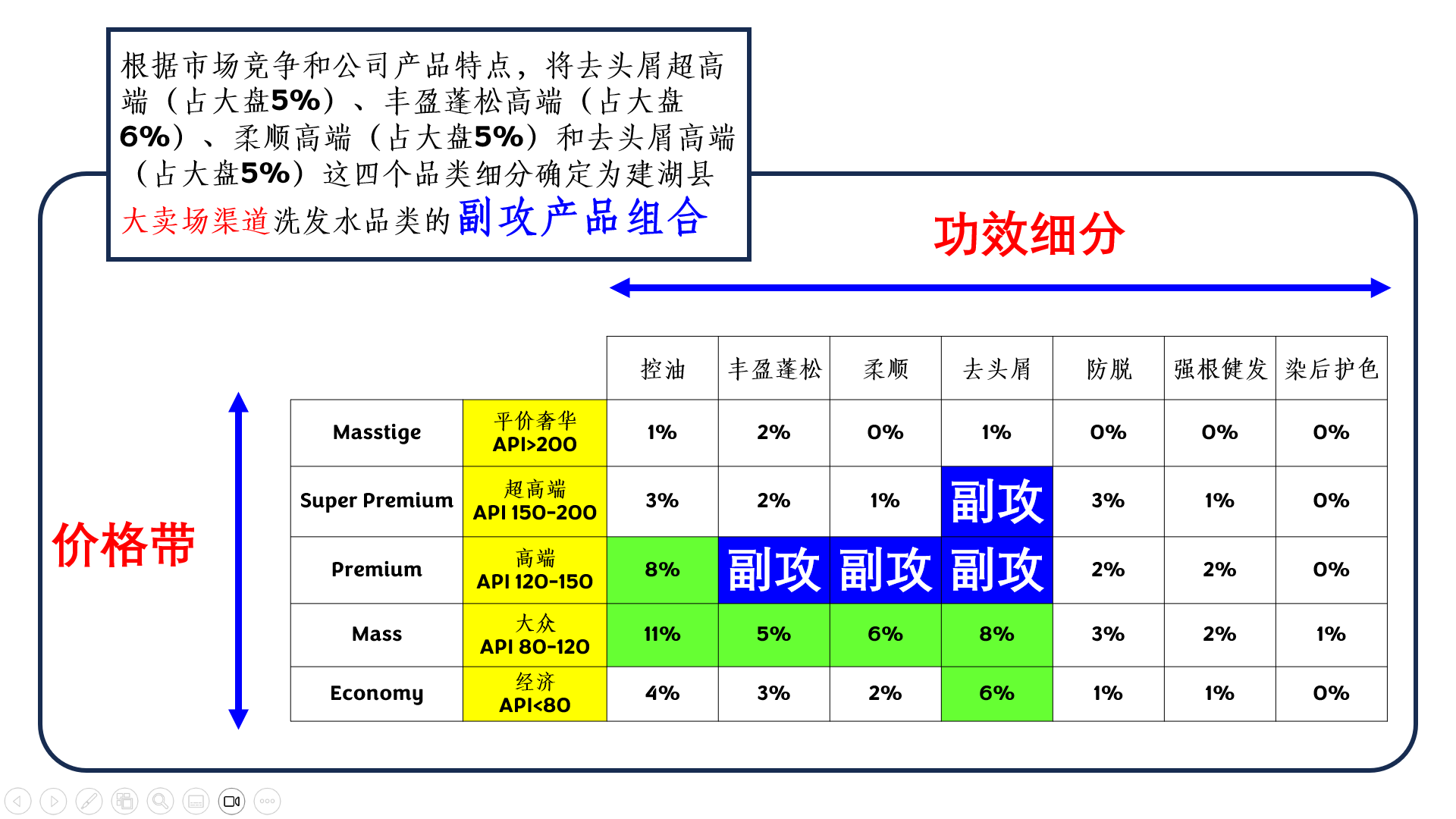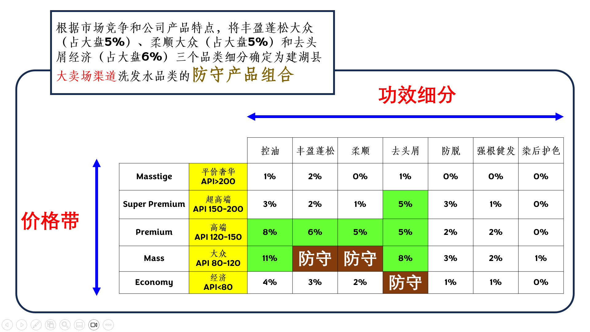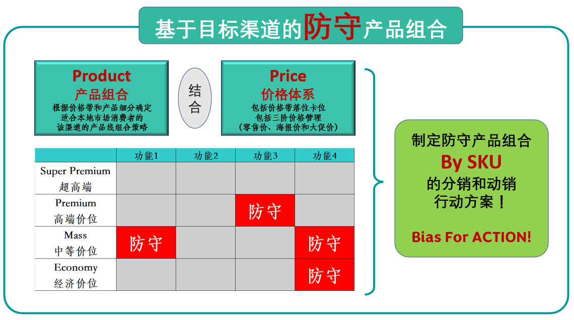 “主攻”战术类型:根据该品类细分的价格带和功效带来设定符合这个细分的产品组合,而这个产品组合尽可能是公司的主打核心品、畅销品,由此作为该渠道的主攻产品组合。