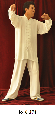 接上式,腰上提向左旋转,身体随向左转动,眼神随之向左看。挤式不变,随身向左转至正南,向上方穿掌, 右脚随之内转, 脚尖朝向南; 腰微拱,穿掌的两臂顺势向下採,重心落于右腿,呈微倚式; 腰向右外旋转, 身体稍侧向西北, 两臂随之翻转向右后,两掌指尖斜指向地面,掌心朝下。左掌落置右肋旁,右臂舒伸直落置右胯后侧;左腰上提,左脚外开,脚尖转向正南,与左肩平行;右腰上提,带动两臂平弧向正南,成左弓步;腰向左拱撑,两臂向左下划大平弧,重心移至右腿;两臂继续向下划弧,随重心转移后倚收回腹前,呈两掌相对微合在一起(见图6-367至6-377)。腰微拱旋转向右,身体带右肘随之微转向稍西北,打出右边肘;腰回转微含,随之上提,右臂顺势向右外斜上方平送打开, 右掌变勾手,略高于肩。左手仍置腹前;左腰微拱向左外转,提左膝, 左脚向左前上方迈出一大步,身体转向正东。左腰继续上提,左臂随之向前掤出。右脚随身内转,脚尖朝向东南,呈大左弓步;腰微拱,身体稍后倚,将左掤出的手掌顺势向内旋翻,掌心向下採按至腹前。腰随即上提,左掌随向左前上方掤推。