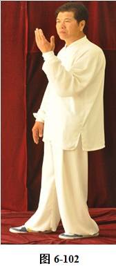 接上式,腰微拱,重心渐渐移至左腿,右手随重心转移向左下腹划弧捋至左肋旁。手心翻转向上,左手随腰拱,向外上方划弧翻转掌心向下,高与肩平,成左抱球状。右腰上提,右脚随即向前迈出小半步,右手臂上翻向前打掤(见图6-100至6-107)。