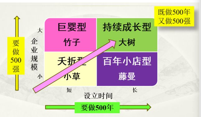 公司到底是做大还是做久?有些公司提出来,能不能两者相结合?有些公司以做久为导向宁做“五百年”不做“五百强”。还有的公司,导向就是只做“五百强”不做“五百年”。林子大了,什么样的鸟儿都有,企业也不例外。中国文化常讲“中庸之道”,现实中,往往是按照图1-2中这个斜线方向去走的。