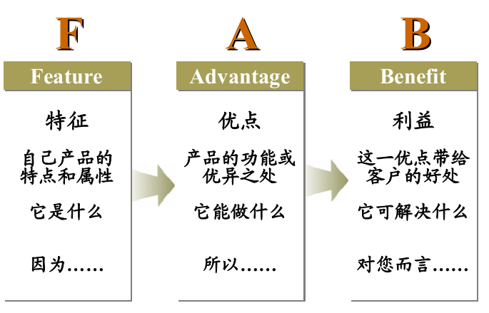 价值主张四个步骤的第一步是呈现价值,呈现产品价值采用FAB法则,FAB法则分别代表特征(Feature)、优点(Advantage)、利益(Benefit)。