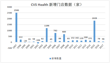 ①通过品牌收购模式进行扩张。从1997年到2017年这20年,CVS Health的门店扩张模式主要通过并购进行。20年中,新增加门店数量总计出现5次大幅变化,1997年新增2500家,2004年新增1196家,2006年新增782家,2008年新增680家,2015年新增1829家。这5次大幅的新增门店变化主要是由于5次大型的商业并购造成的。从数据上看,这5次大型商业并购事件总计并购了6987家,也就是说在这20年中并购药店门店数量约占新增门店总数的87%。据此我们认为CVS Health的门店扩张完全是通过大型品牌并购商业事件完成的。