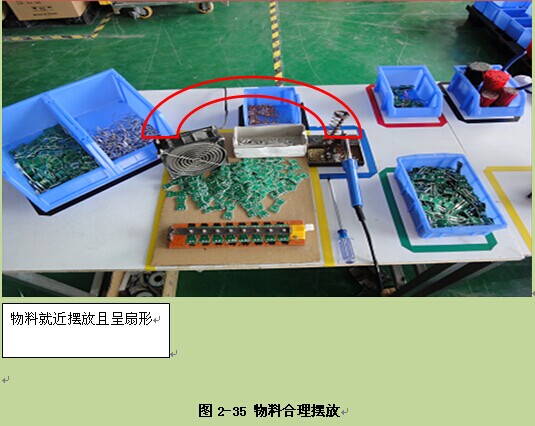 在工作台或机器上将工具一线排放使用,这是不正确的方式。因为工作人员在工作台上的动作范围及动线是呈圆弧状态,而非直线状态。一线排开不但有违前述的动作原理,而且使工作距离拉长。
