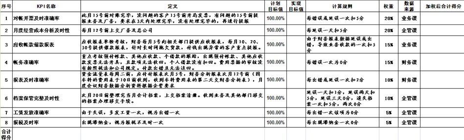 (1)绩效合同示例,有的绩效合同可以只用一张考核表囊括所有指标,具体如表9-6、表9-7、表9-8和表9-9所示。