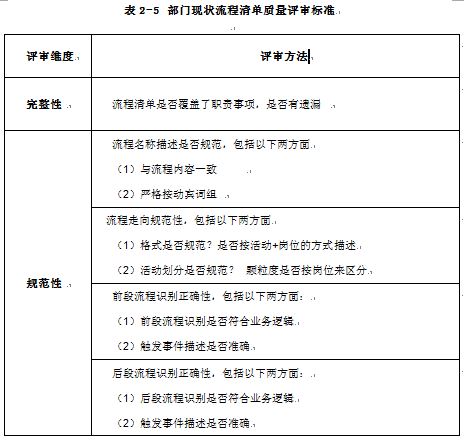 完成各部门现状流程清单盘点后,公司流程规划执行组应对各部门提交的部门现状流程清单盘点表进行审核,对于不符合要求的提出明确的修改意见,由各部门流程规划负责人组织进行完善,直到合格为止。对于部门流程现状清单的质量评审标准如表2-5所示。