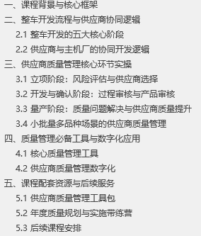 课程核心围绕汽车行业供应商全生命周期质量管理展开,以 “预防为主” 为目标 —— 基于质量成本曲线,越早期发现问题,整改成本越低,因此需从产品立项到批量生产全程管控。课程主要涵盖八大模块:供应商风险评估、供应商选择、过程审核、产品审核、质量问题解决流程、供应商质量提升、质量管理必备工具、供应商质量管理数字化,同时结合汽车行业特性,拆解实操要点与落地方法。