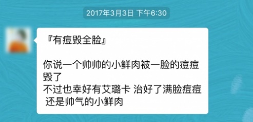 植入广告没有详细说明产品功效,原因在于:首先,痘痘成因很复杂,很难通过几行文字讲清楚;其次,太生硬插入不如设置诱饵,通过私聊来阐述产品功效。