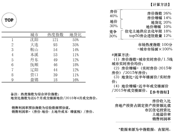 市场热度指数重点考察市场房价、地价现状及涨幅情况,进驻潜力和市场竞争热度,来分析目前的市场热度。辽中南城市群地货比指数中位值为14%,整体来看市场机会适中,可适当进入。热度指数TOP3城市为:沈阳、大连、鞍山。