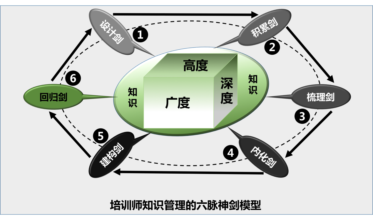 前面已经提到培训师的知识需要考量广度、深度、高度三个维度,作者依照自身的实践经验,建构了一个培训师知识管理的六脉神剑模型,如图8-3所示。