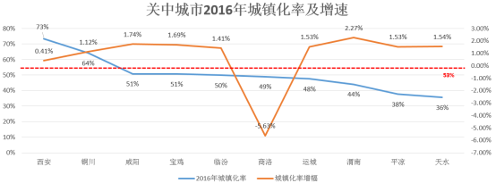 关中城市群10个城市城镇化率在53%以上的城市共2个,分别为西安、铜川; 10个城市2016年城镇化率增幅在-5.63%—2.27%之间,平均城镇化率增幅为1.1%。商洛城镇化率呈现负增幅,西安因原有城镇化率水平较高,增幅缓慢,增幅达到1%。