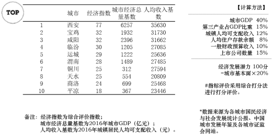 关中城市群城市基本面综合排名TOP3的城市为:西安、渭南、咸阳。处在城市发展较好区、适中区、较差区的城市个数比为3:4:3。