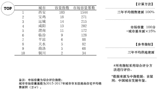 关中城市群城市市场容量基数均值为215万㎡ 。市场容量及安全指数TOP3的城市为:西安、宝鸡、运城。