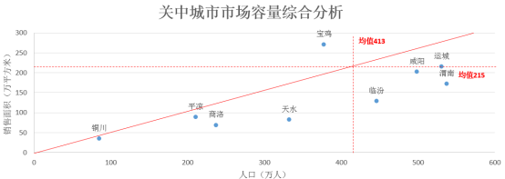 市场容量从商品住宅销售面积和常住人口两个维度考虑。人口规模较大且距离轴线向下偏离越大代表市场潜在容量越大。重点关注城市有渭南、临汾、天水等。(其中,西安商品住宅销售面积1544万平米,常住人口规模883万人)