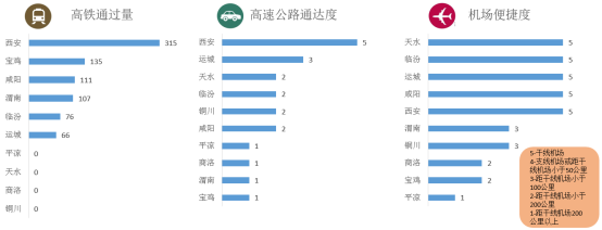 机场方面:咸阳机场是中国主要的干线机场,是我国十大机场之一,也是民航总局规划的八大枢纽机场之一;公路与铁路:关中城市群中公路线路呈“米”字形,横向主要为沪陕高速、连霍高速;纵向主要为京昆高速、包茂高速和福银高速;铁路线路呈“大”字形。横向主要为陇海铁路、宝中铁路和大西铁路。