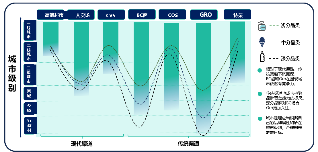 越是高线城市,现代渠道占比更大!渠道组合更加多元化,新兴渠道越多越活跃;越是低线城市,传统渠道占比更大!渠道组合相对简单,新兴渠道越少不活跃。