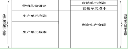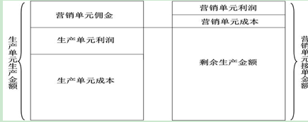 在分配方式A中,营销一线依靠生产一线支付的佣金而运转,实际上起到了生产一线和外部市场的“中介”作用。生产单元包括生产单元的成本、生产单元利润和营销单元的佣金,而营销单元按照生产单元金额的一定比例提取佣金,佣金包括营销单元成本和营销单元利润。如图6-2所示。