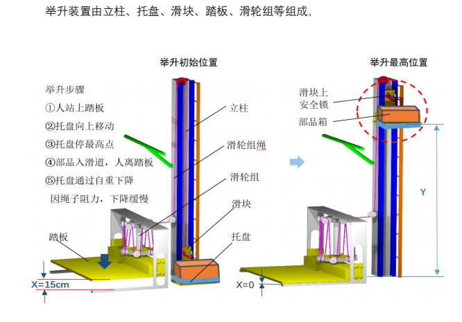 此外,该装置的正常运作有一个重要条件:在举升时,人和踏板的总重量一定要大于 12 倍的重物与托盘的总重量。也就是说,人越重,施加给踏板的压力越大,装置就越能轻松、快速地将料箱举升起来 。