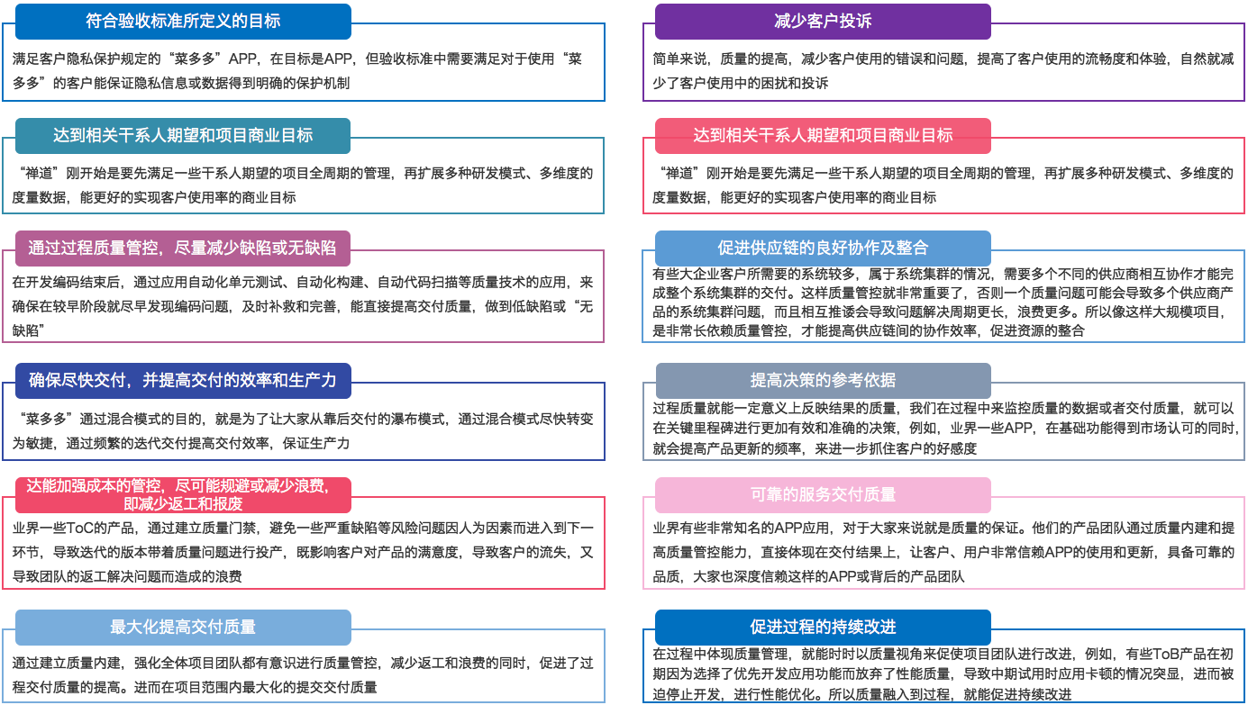 (12)促进过程的持续改进等。在过程中体现质量管理,就能时时以质量视角来促使项目团队进行改进。例如,有些To B产品在初期因为选择了优先开发应用功能而放弃了性能质量,导致中期试用时应用卡顿的情况突显,进而被迫停止开发,进行性能优化。所以,质量融入过程,就能促进持续改进。